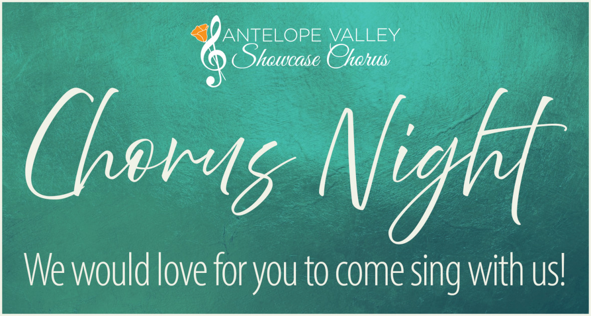 Sing with Us on Tuesday Nights in the AV Basic event infoEvent date: Oct 28 2025 - 7:00pm to 9:00pmLocation: Rehearsal Hall 5025 Columbia Way (Ave M) Quartz Hill , CA United States See map: Google Maps California US Public event fieldsBarbershop singing is a dynamic style of a cappella singing. Do you like to sing in your car? Are you a former theater kid looking for a new outlet? Come join the Antelope Valley Showcase Chorus for an evening of fun, friendship and musical challenge. We are looking for harmony-loving vocalists and performers. Check out a couple of our rehearsals. If you enjoy singing with us and decide you want to continue, we'll explain the audition process and what it takes to become a member of our chorus and Sweet Adelines International.