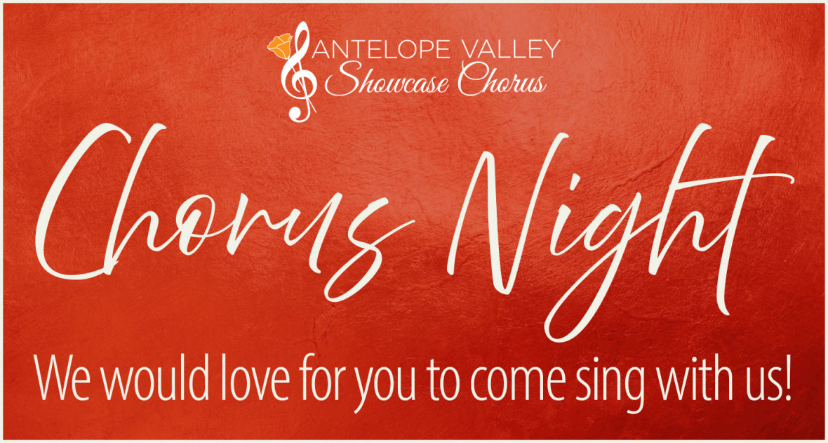 Sing with Us on Tuesday Nights in the AV Basic event infoEvent date: Nov 4 2025 - 7:00pm to 9:00pmLocation: Rehearsal Hall 5025 Columbia Way (Ave M) Quartz Hill , CA United States See map: Google Maps California US Public event fieldsBarbershop singing is a dynamic style of a cappella singing. Do you like to sing in your car? Are you a former theater kid looking for a new outlet? Come join the Antelope Valley Showcase Chorus for an evening of fun, friendship and musical challenge. We are looking for harmony-loving vocalists and performers. Check out a couple of our rehearsals. If you enjoy singing with us and decide you want to continue, we'll explain the audition process and what it takes to become a member of our chorus and Sweet Adelines International.