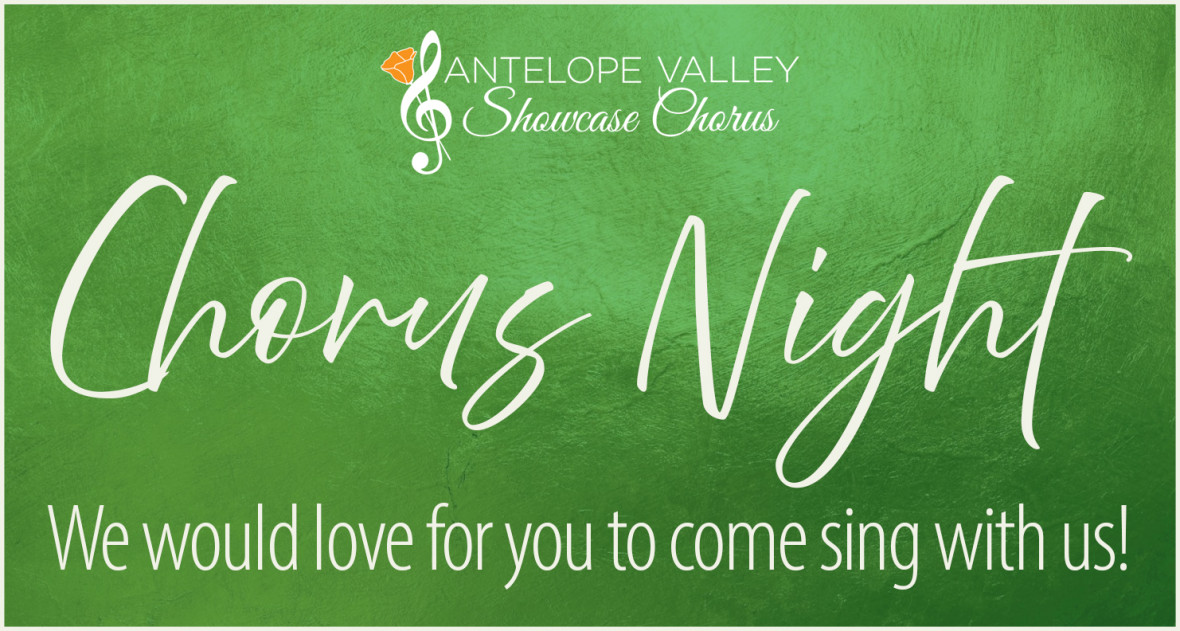 Sing with Us on Tuesday Nights in the AV Basic event infoEvent date: May 19 2026 - 7:00pm to 9:00pmLocation: Rehearsal Hall 5025 Columbia Way (Ave M) Quartz Hill , CA United States See map: Google Maps California US Public event fieldsBarbershop singing is a dynamic style of a cappella singing. Do you like to sing in your car? Are you a former theater kid looking for a new outlet? Come join the Antelope Valley Showcase Chorus for an evening of fun, friendship and musical challenge. We are looking for harmony-loving vocalists and performers. Check out a couple of our rehearsals. If you enjoy singing with us and decide you want to continue, we'll explain the audition process and what it takes to become a member of our chorus and Sweet Adelines International.